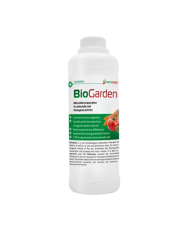BioGarden is a soil microbiological preparation designed for home gardens and pot/greenhouse crops. The product information describes it as supporting soil biological activity, improving soil balance, and helping plants cope with stress.