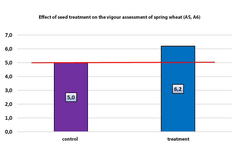 Throughout the season, treated wheat looked stronger. In early to mid-June (A5/A6; 3 and 17 June), average vigour in treated plots reached 6.2. Importantly, this was a statistically confirmed improvement over the control. As a result, plants maintained better condition during key growth stages.